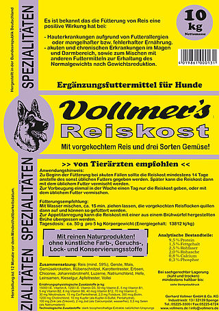 Leichtverdaulich, mit vorgekochtem Reis und verschiedenen Gemüsesorten: Vollmer’s Reiskost ist ein Ergänzungsfutter für Hunde aller Rassen. In Kombination mit Fleisch oder Fisch (frisch, gefrostet oder in Dosenform) ist es eine leichtverdauliche Vollnahrung, die jedem Vierbeiner schmeckt. Vollmer’s Reiskost enthält 69 Prozent glutenfreien, vorgegarten Reis – eine besonders bekömmliche Quelle an Kohlenhydraten. Das Ergänzungsfutter ist angereichert mit Gemüse, Kräutern, milden Gewürzen, Vitaminen, Mineralien und Spurenelementen. All diese Zutaten sind voller bioregulierender Vitalstoffe, abgestimmt nach Vollmer’s Bio-Vital-Komplex PLUS. In ihrer Zusammensetzung fördern sie die Gesundheit, Leistungsfähigkeit und das Wohlbefinden des Tieres. Wertvolle Omega 3 und Omega 6 Fettsäuren begünstigen ein gesundes glänzendes Fell.