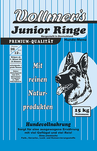 Vollmer’s Junior Ringe ist das ideale Erstfutter, abgestimmt auf die Ernährungsbedürfnisse junger Hunde mittelgroßer und großer Rassen ab der 12. Woche bis 18 Monate (Endgewicht ab 20 Kilogramm). Die ausgewählten Zutaten werden in einem schonenden Produktionsverfahren im Extruder bei nur 95 Grad gegart. Wegen der verlängerten Garzeit sind Vollmer’s Junior Ringe leicht bekömmlich. Wichtige Vitamine und Spurenelemente bleiben erhalten und unterstützen die Entwicklung des jungen Hundes während der gesamten Wachstumsphase.