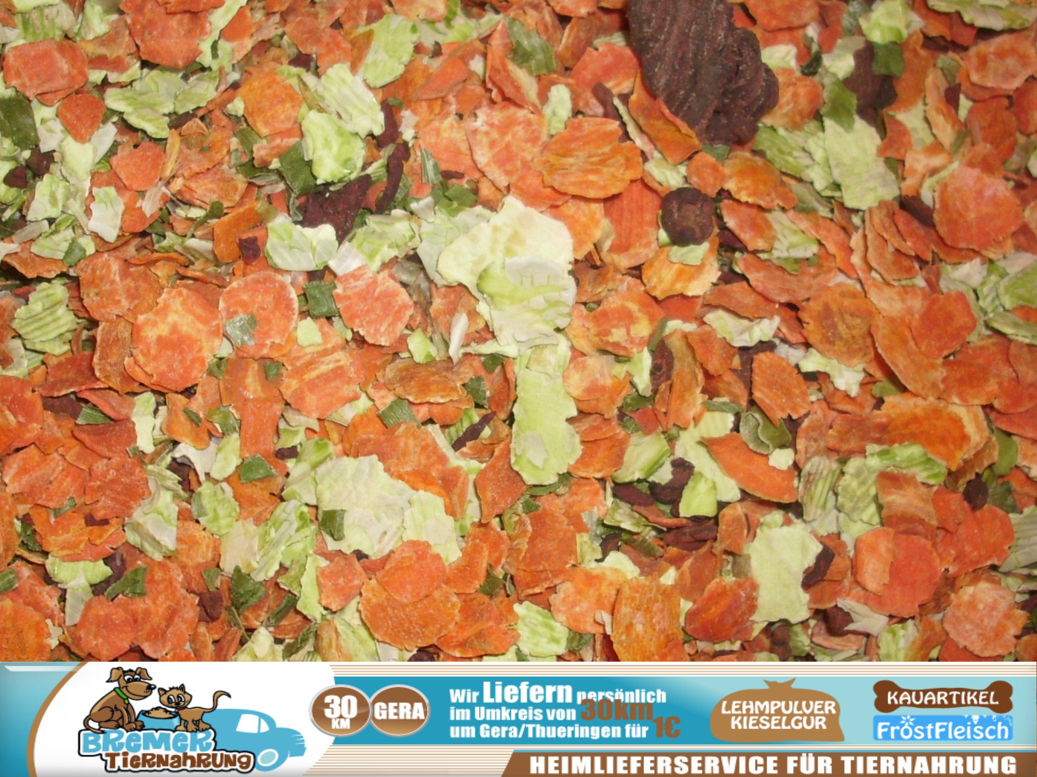Der Gemüse-Mix bitte 20 Minuten vor der Fütterung mit warmen Wasser oder Brühe anrühren und dann mit Dosen- oder Frischfleisch vermischen. Empfehlenswert ist auch die Zugabe einer Vitamin- Mineralstoffmischung.
